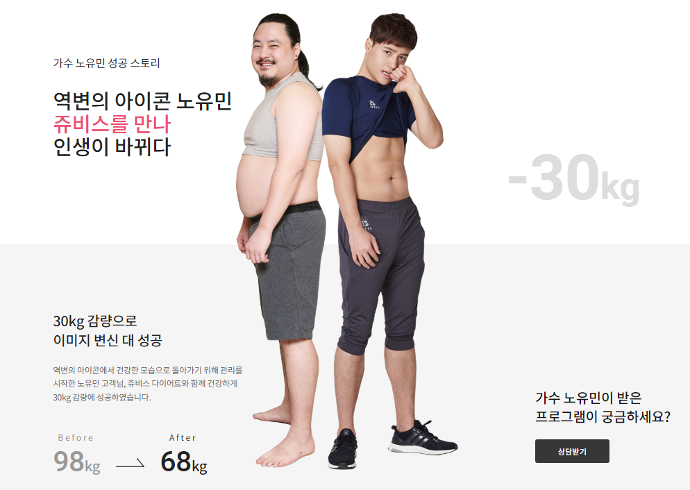 "노유민 다이어트"는 2015년 30kg 감량 후 지금까지 유지 중인 대표 사례입니다. 정기적인 요요방지 관리와 데이터 분석을 통해 쥬비스 프로그램이 그의 일상에 안정감을 주고 있습니다. 감량 후 삶의 질 개선까지 보여준 노유민 다이어트는 수많은 고객님께 귀감이 되고 있습니다. |