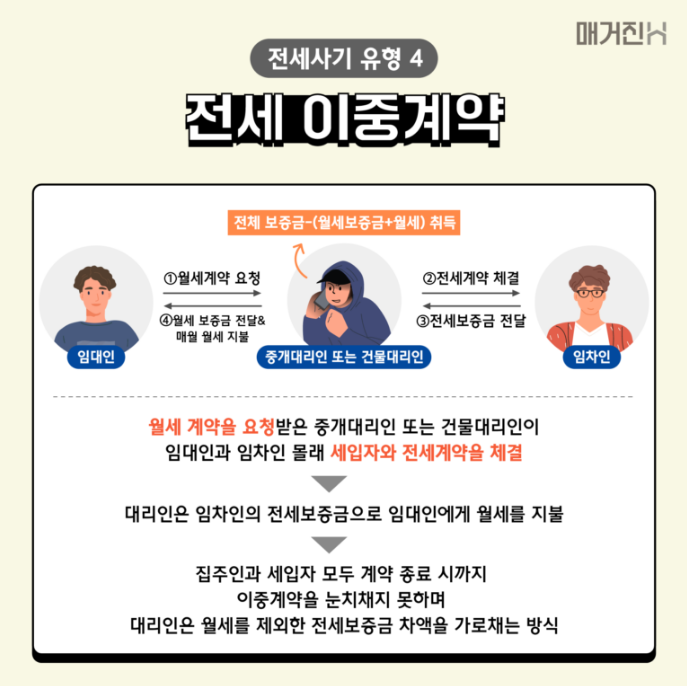 이중계약은 동일한 집에 대해 복수의 세입자와 전세계약을 맺거나, 전세-월세 계약을 이중으로 체결하는 사기 수법입니다. 주로 공인중개사가 임대인과 공모하여, 임대인에게는 월세 계약서를 제출하고, 세입자에게는 전세 계약서와 확정일자를 제공하는 방식입니다. 법적으로는 후순위자나 허위 계약서에 해당되어 보증금을 보장받기 어렵습니다.