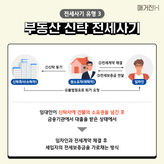 신탁사기는 임대인이 부동산의 소유권을 신탁회사에 이미 넘긴 상태에서 이를 숨기고 세입자와 전세계약을 체결하는 방식입니다. 소유권이 신탁사에 있는 상태에서 체결된 계약은 효력이 약해, 이후 경매가 진행되면 세입자는 신탁회사의 채권자에게 밀리게 됩니다. 이 사기는 일반 등기부등본 열람만으로는 신탁여부가 보이지 않아 더욱 위험합니다.