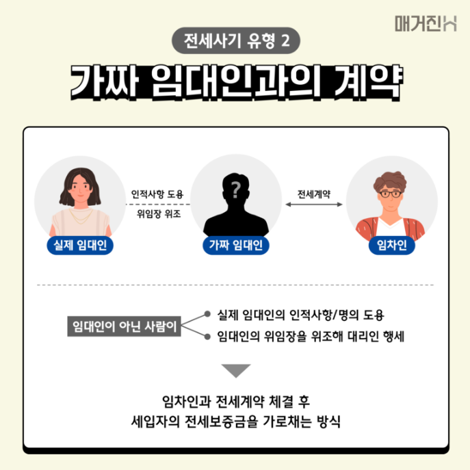 대리인 사칭은 임대인 행세를 하는 사기범이 건물주의 신분을 위조하거나, 실제 소유주인 것처럼 가장해 세입자와 계약을 맺고 보증금을 편취하는 유형입니다. 위조된 신분증, 허위 위임장 등을 통해 사칭하기 때문에 세입자는 실제 소유자와 계약을 했다고 착각하게 됩니다. 공인중개사가 확인 없이 중개한 경우 책임 문제도 복잡해질 수 있습니다.