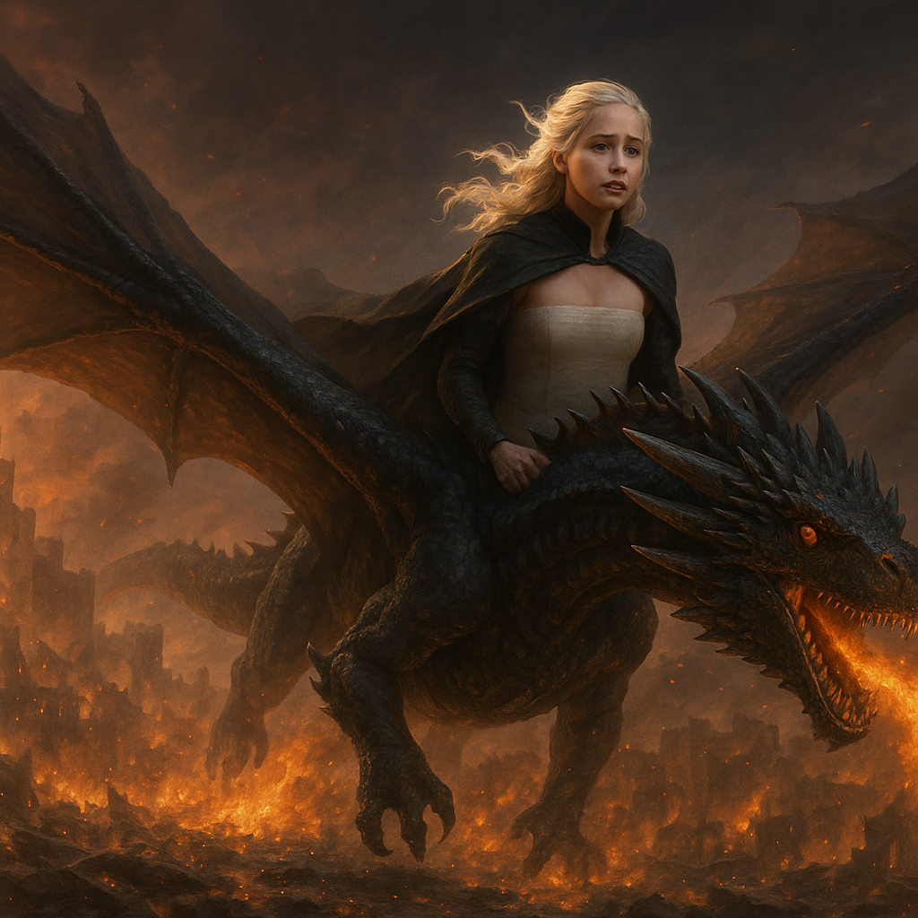 [AIFig-13: Daenerys on Drogon destroying King's Landing, flames and destruction below, tragic expression on her face, apocalyptic scene]