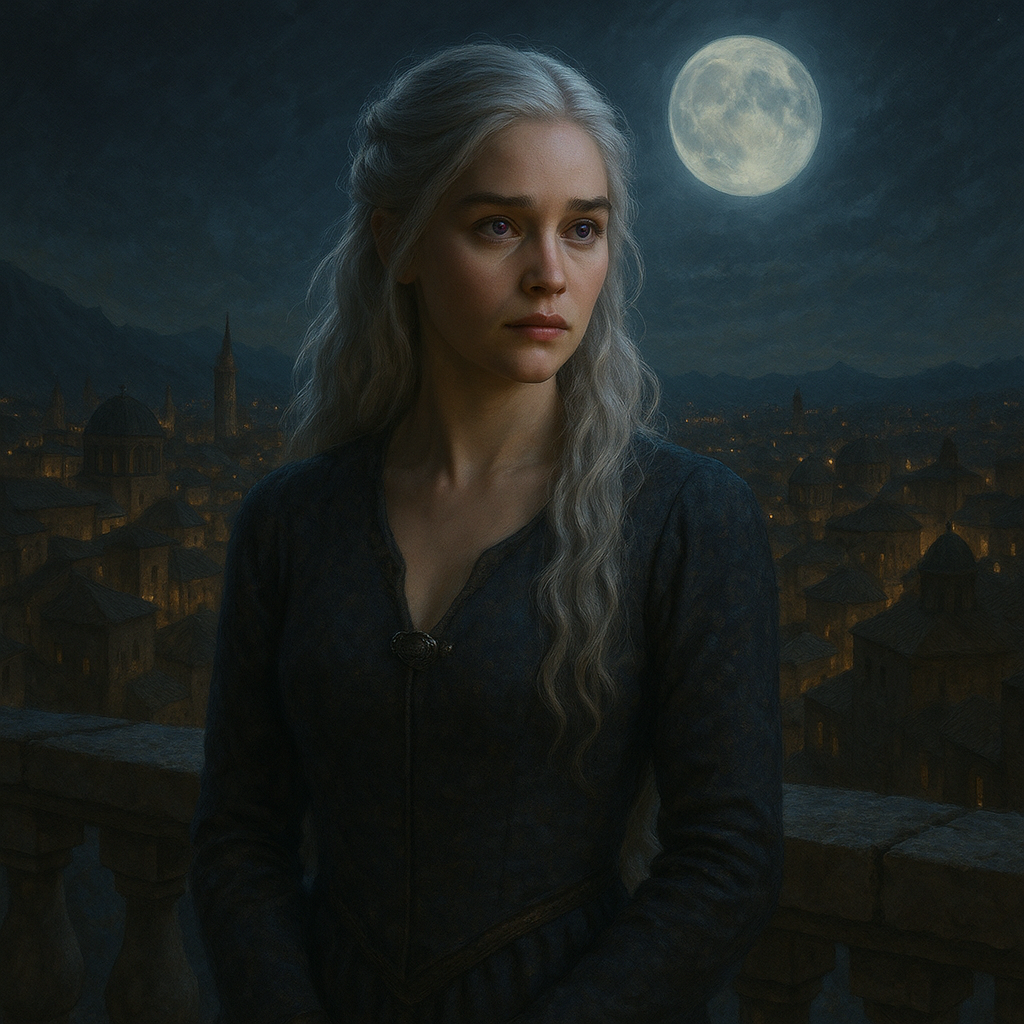 [AIFig-01: A young silver-haired woman in exile, standing on a balcony overlooking Pentos, purple eyes reflecting moonlight, medieval fantasy setting]