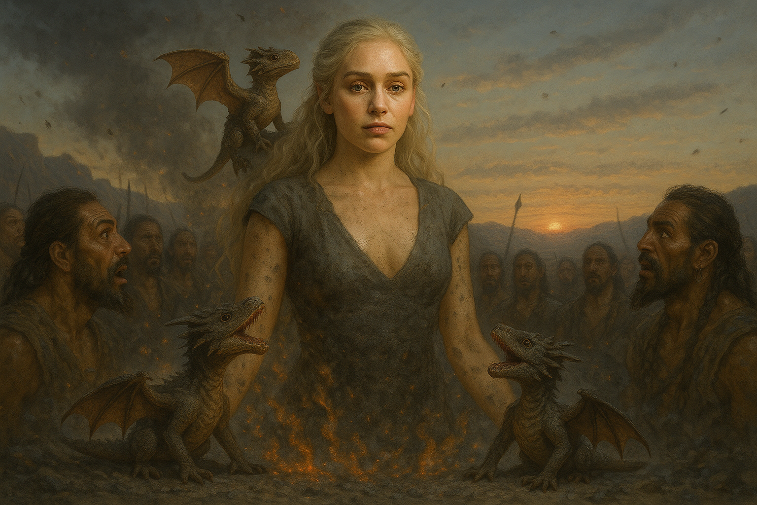 [AIFig-03: Daenerys emerging from flames with three baby dragons, surrounded by ashes and amazed Dothraki, dawn breaking in the background, epic fantasy art]