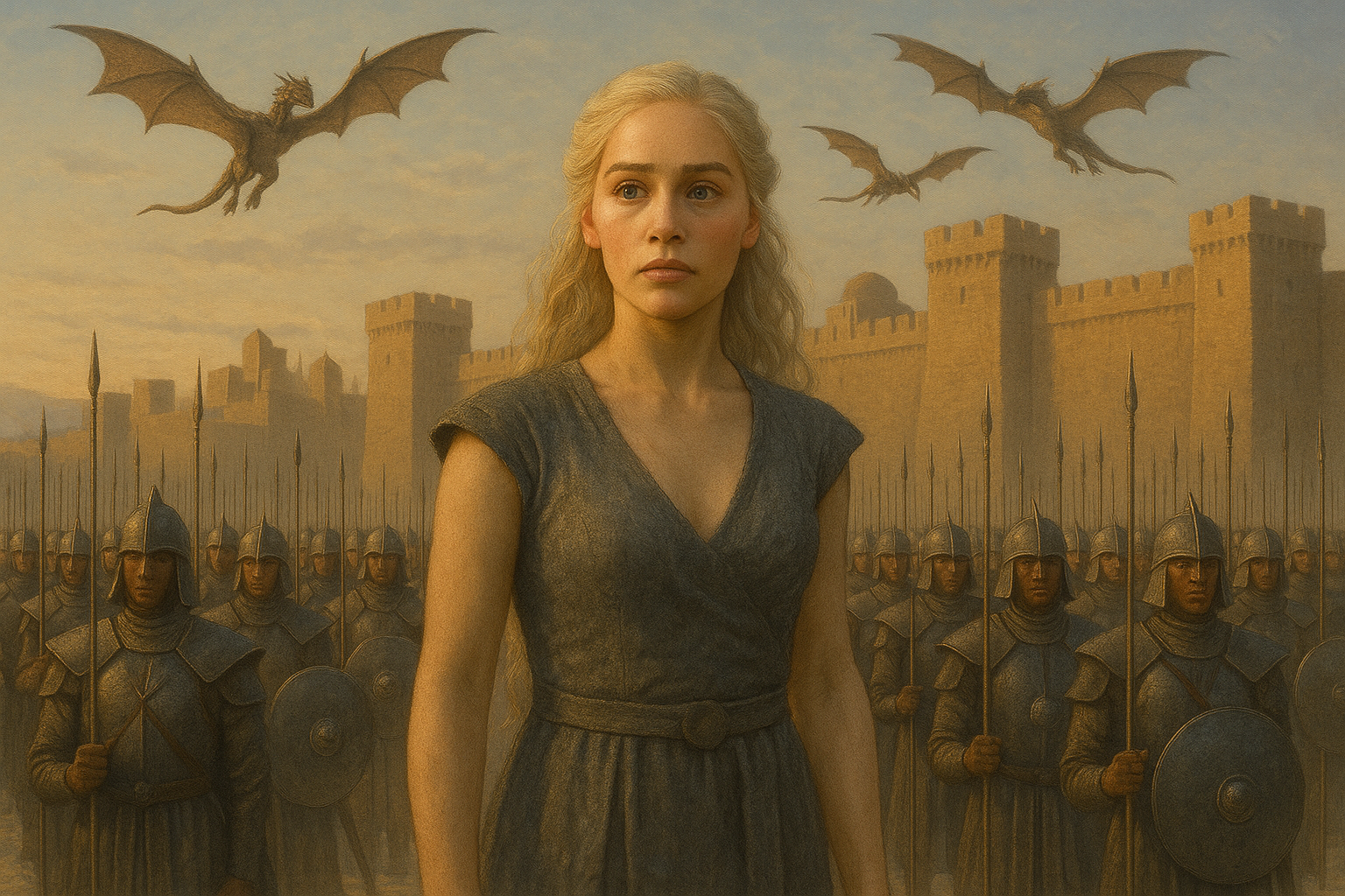 [AIFig-04: Daenerys standing before the walls of Astapor, three dragons flying overhead, Unsullied army formation, desert city backdrop]