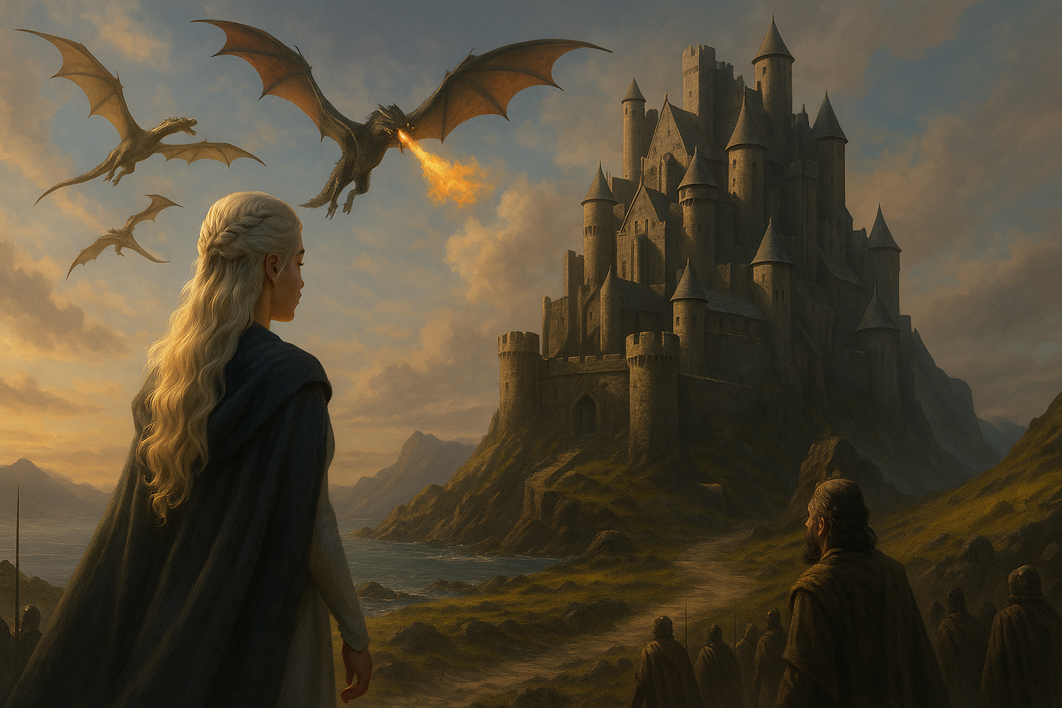 [AIFig-10: Daenerys first arriving at Dragonstone, three dragons flying overhead, ancestral castle in background, homecoming scene]