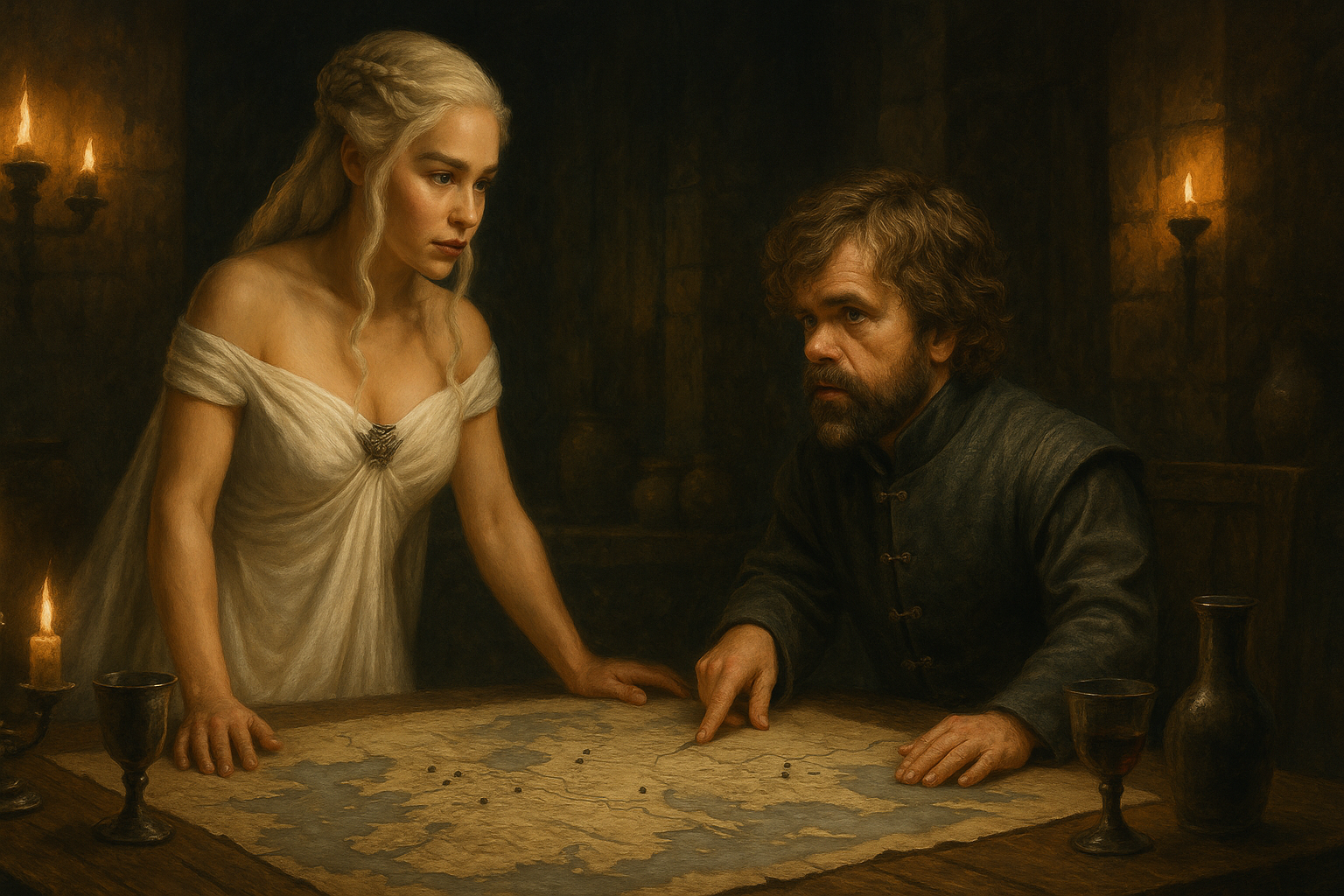 [AIFig-09: Daenerys and Tyrion discussing strategy in Meereen, maps and wine on the table, political intrigue atmosphere]