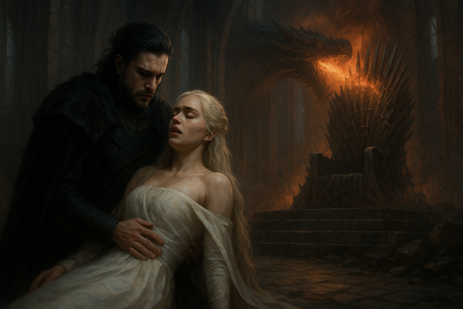 [AIFig-14: Jon Snow holding dying Daenerys in the Iron Throne room, Drogon in the background breathing fire on the throne, tragic and dramatic scene]