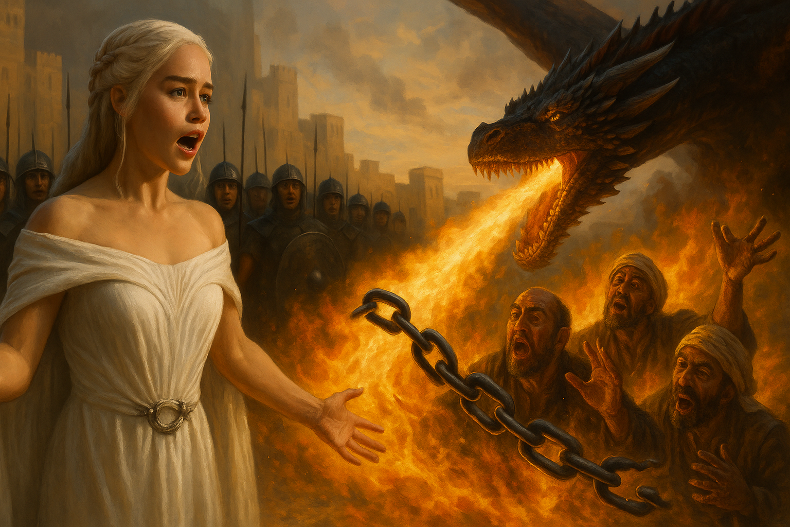 [AIFig-05: Daenerys speaking perfect Valyrian while Drogon breathes fire on slavers, Unsullied looking amazed, chains breaking symbolically]