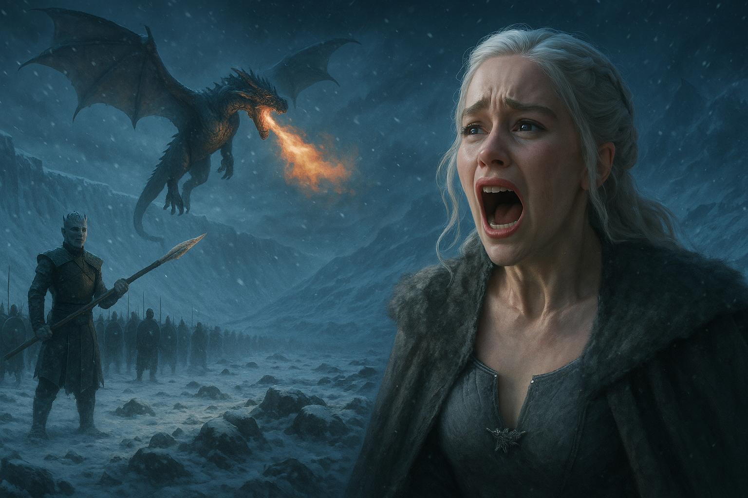 [AIFig-12: Viserion falling from the sky beyond the Wall, Night King with ice spear, Daenerys screaming in anguish, dramatic winter scene]