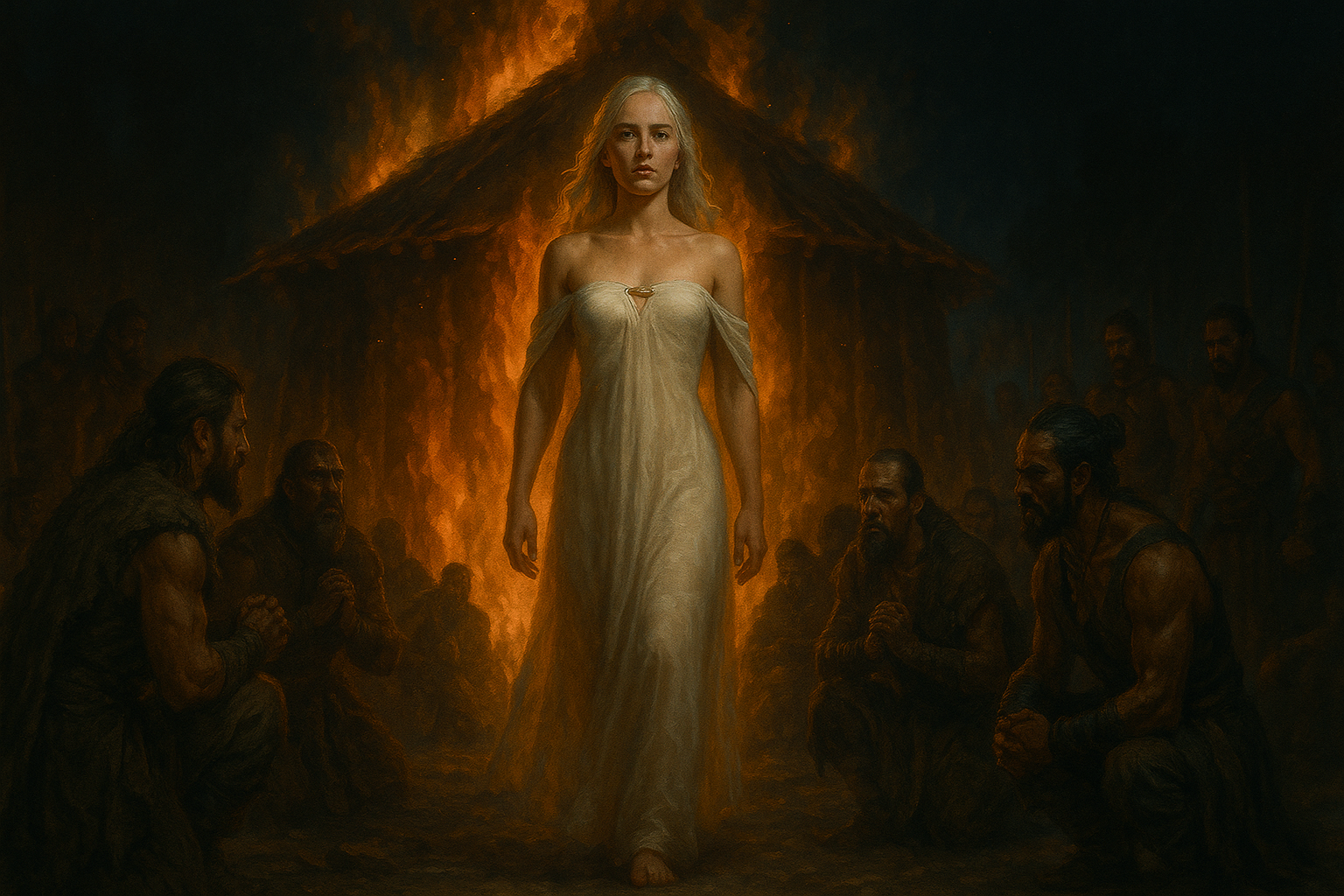 [AIFig-08: Daenerys walking out of burning Dothraki temple, flames surrounding her, Dothraki warriors kneeling in awe, night scene with dramatic lighting]